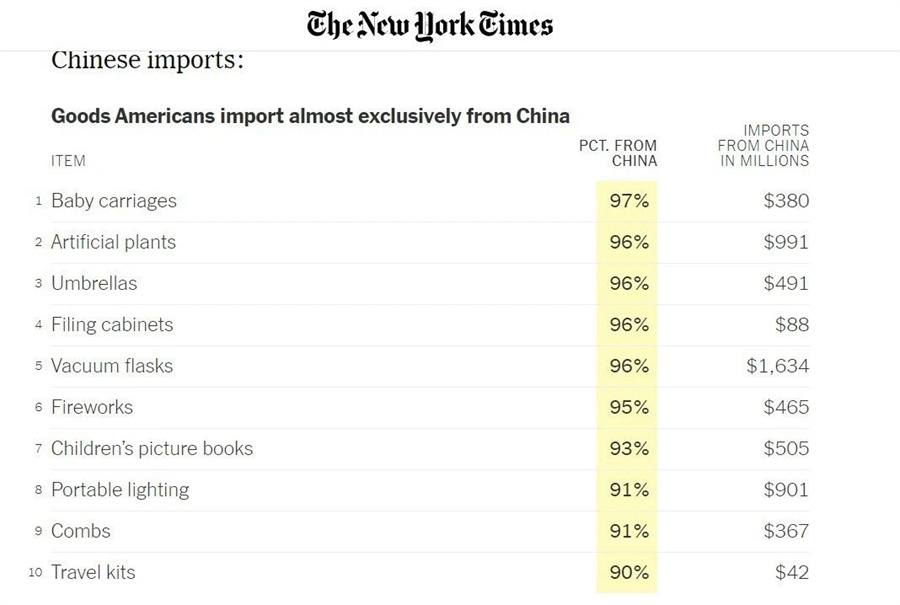 据了解,《纽约时报》发表的一篇文章以梳理清单的方式,展现了普通美国人生活中的“中国制造”,以及关税可能对他们生活产生的影响。