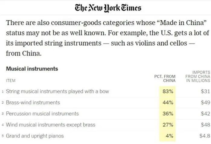 还有一些消费品类别的“中国制造”可能不那么广为人知。例如,美国从中国进口了大量弦乐器,包括小提琴和大提琴。维生素及其衍生物也大量从中国进口,还有各种冷冻鱼类,包括鳗鱼、鳕鱼、罗非鱼等等。