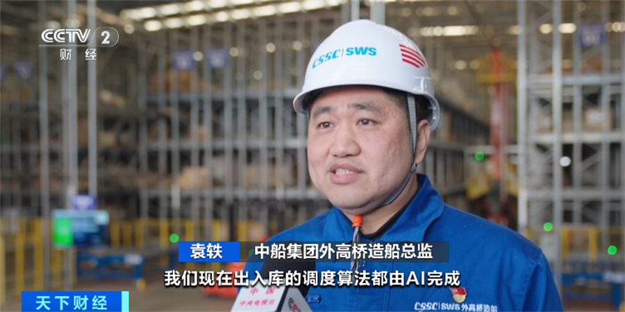 中船集团外高桥造船总监袁轶:我们现在出入库的调度算法都由AI完成。如果两三天就需要用到的物资,就会放在靠近产线的地方。如果物资到早了或者还有余量,就会往里面放,把更好的位置空出来,给更急需的物资使用,这样仓储空间的利用率提高了200%,出入库的效率提升了50%。